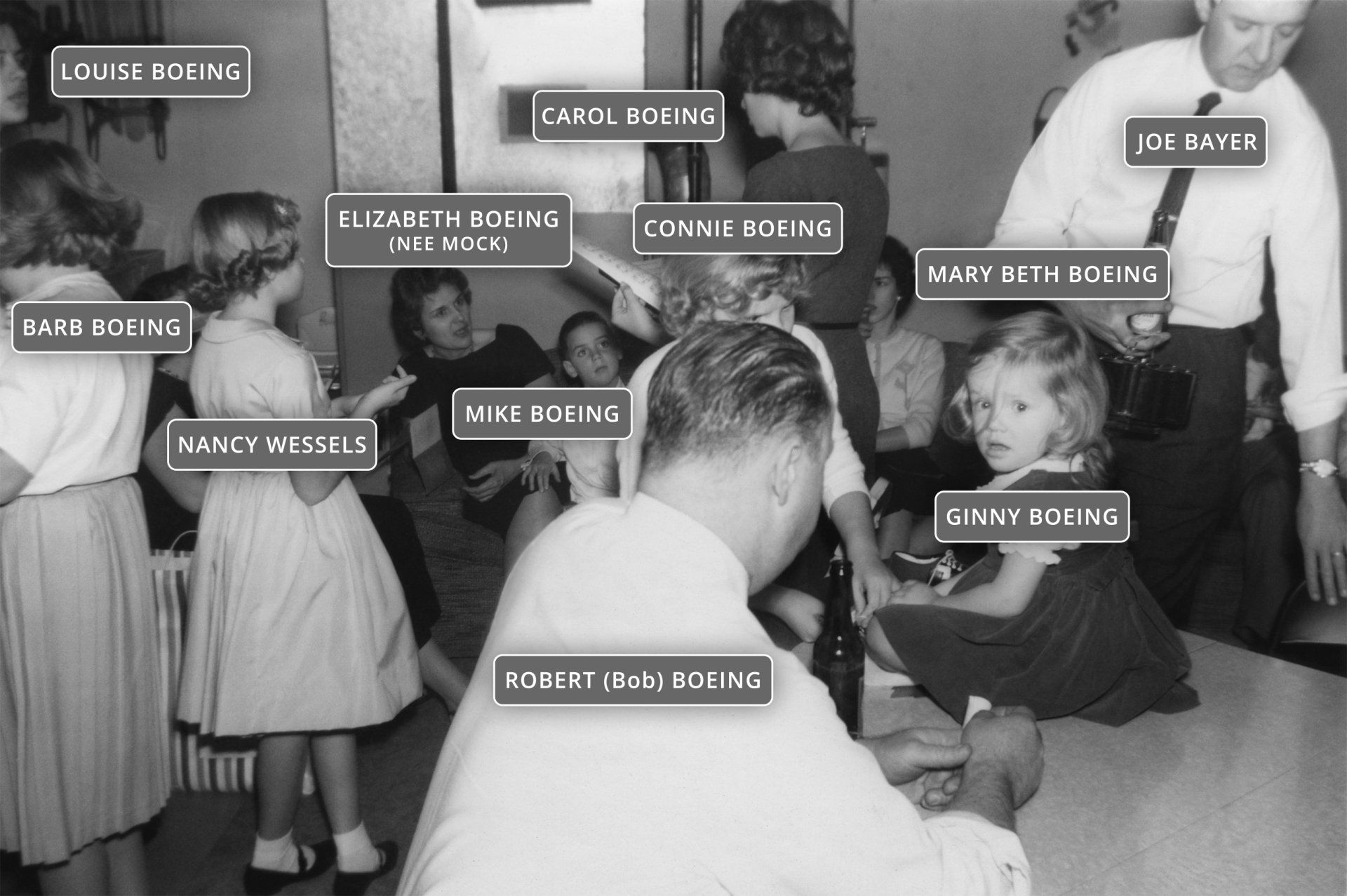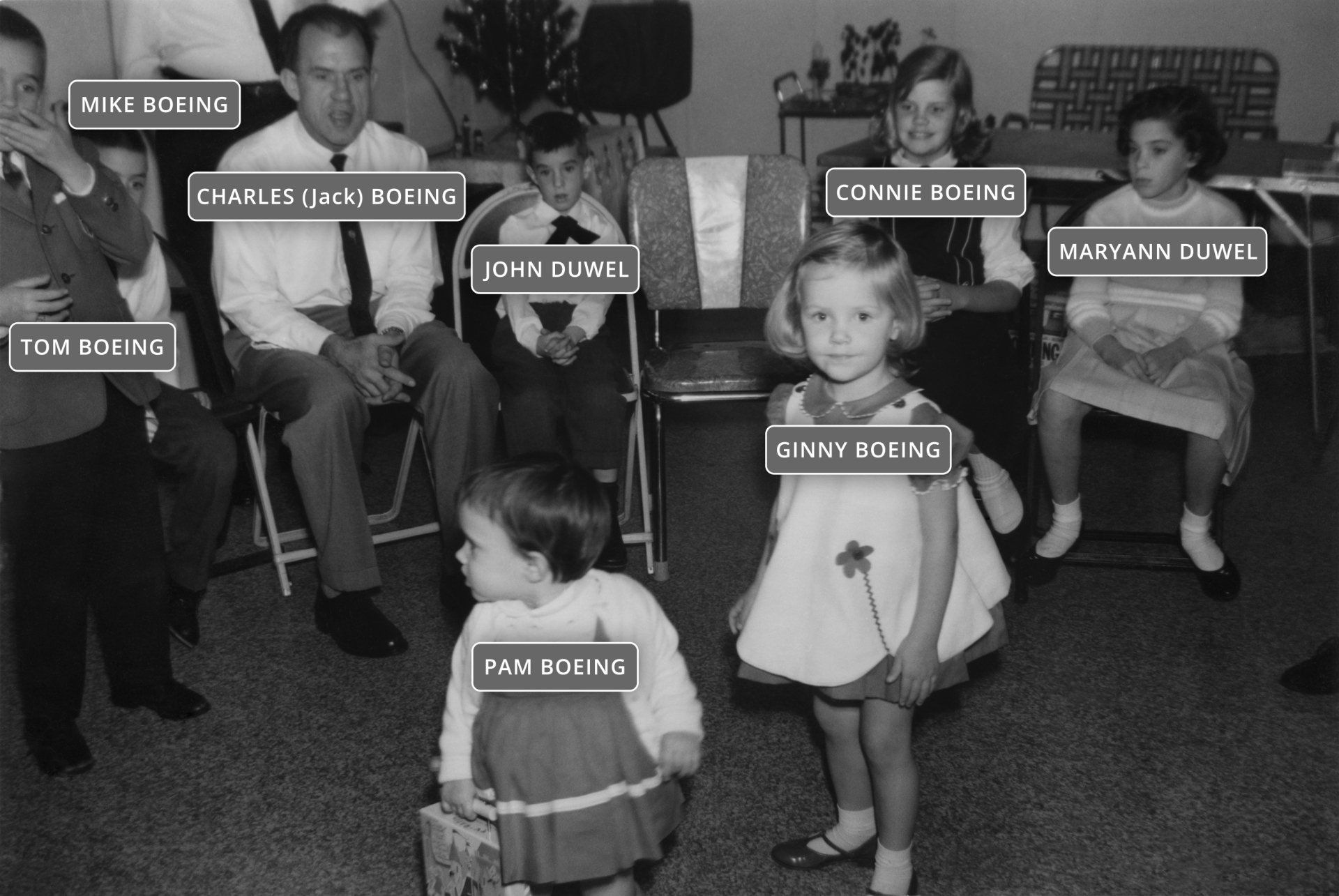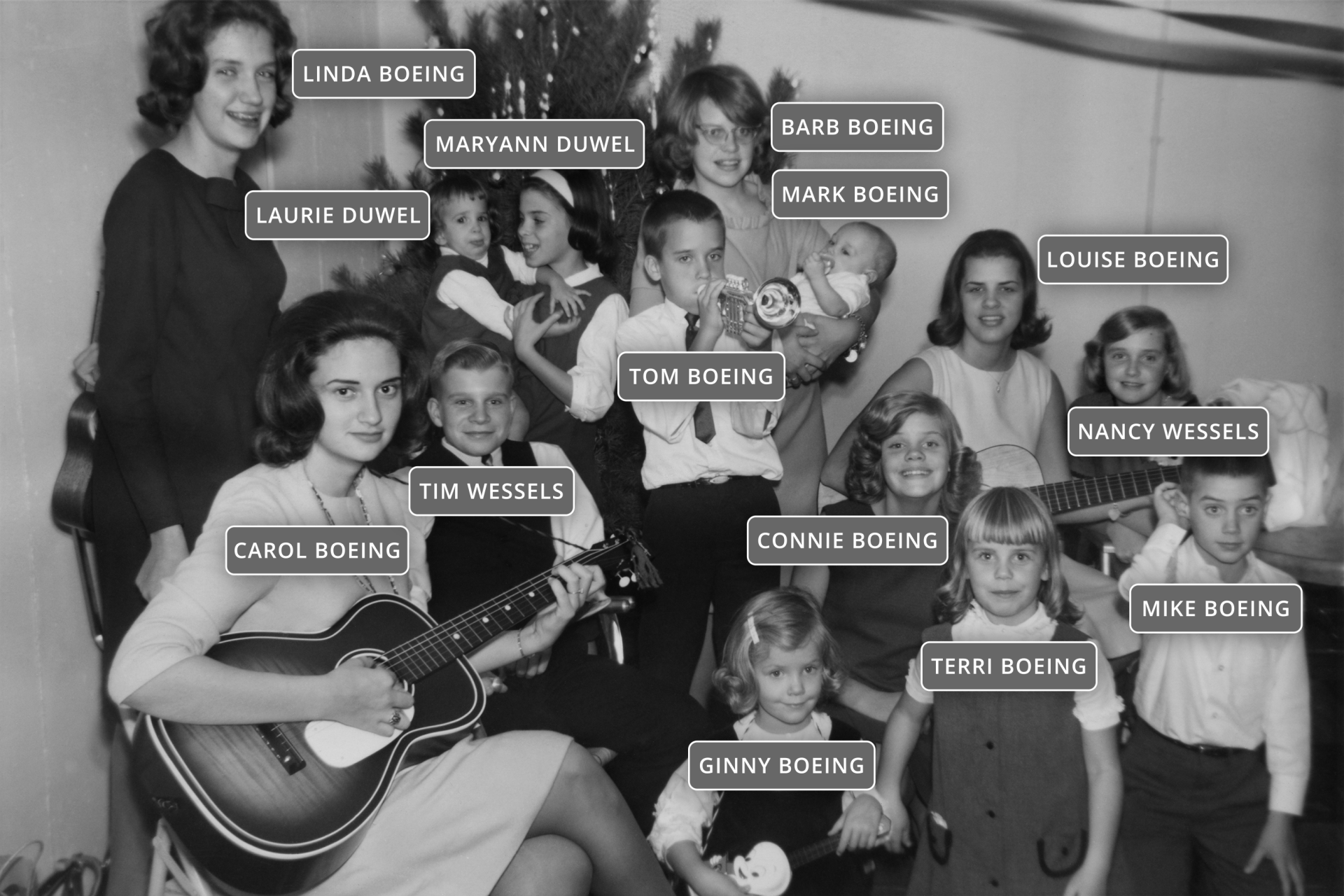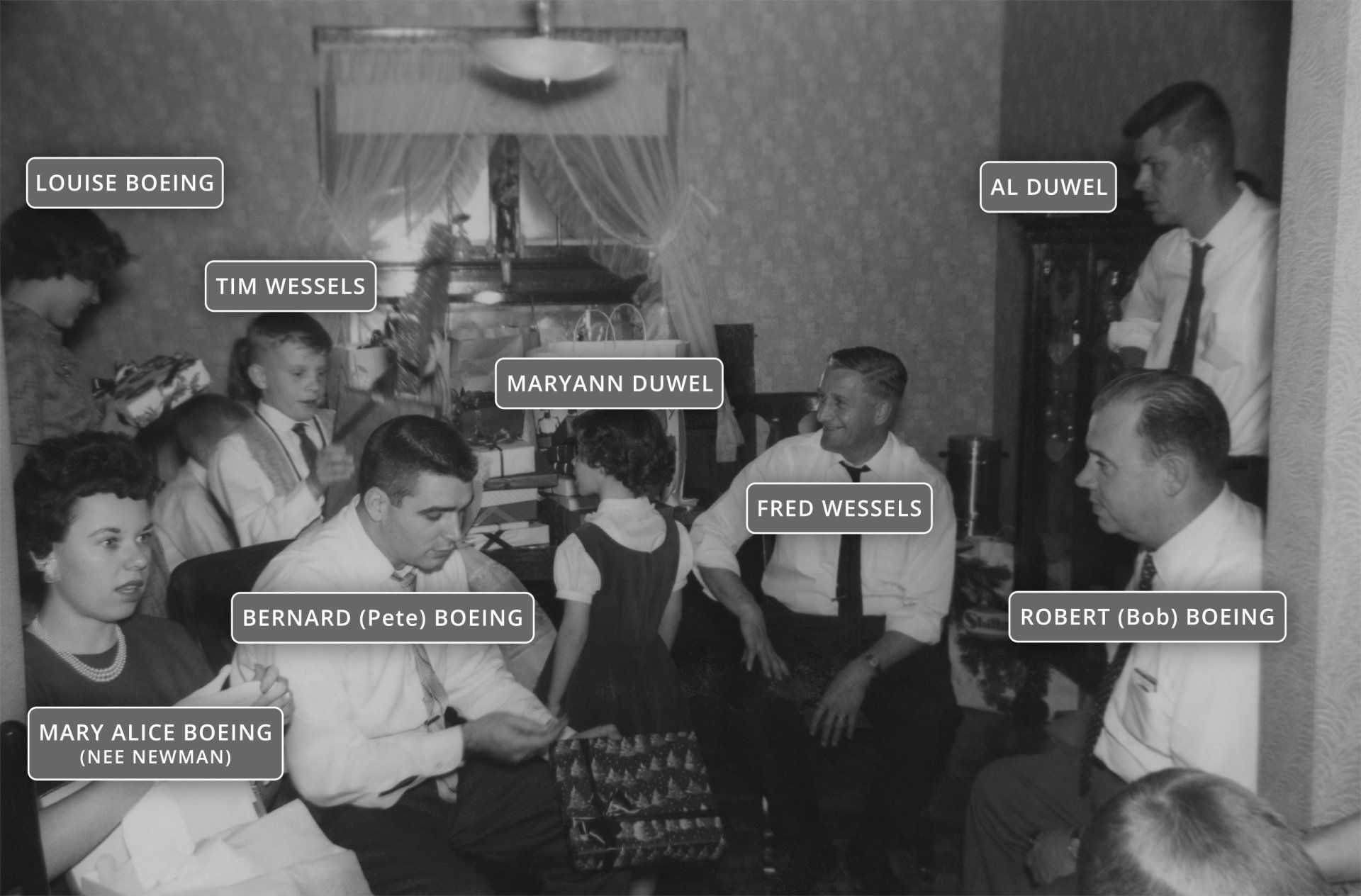 The Christmas 1960 photos were taken at the home of Bernard and Lillie (Bahrs) Boeing. The Christmas 1962 photos were taken at the home of Martha (Boeing) and Al Duwel. The Christmas 1963 photos were taken at the home of Bernice (Boeing) and Joe Bayer. The Christmas 1964 photos were taken at the home of Bernard (Pete) and Mary Alice (Newman) Boeing. Betty (Focke) Boeing shot all the photos.